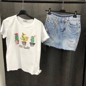 Outfit composto da una t-shirt in cotone stampa frutta con una mini gonna in jeans
